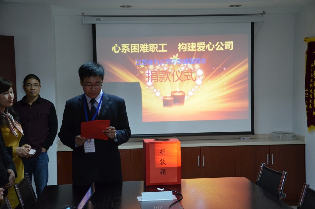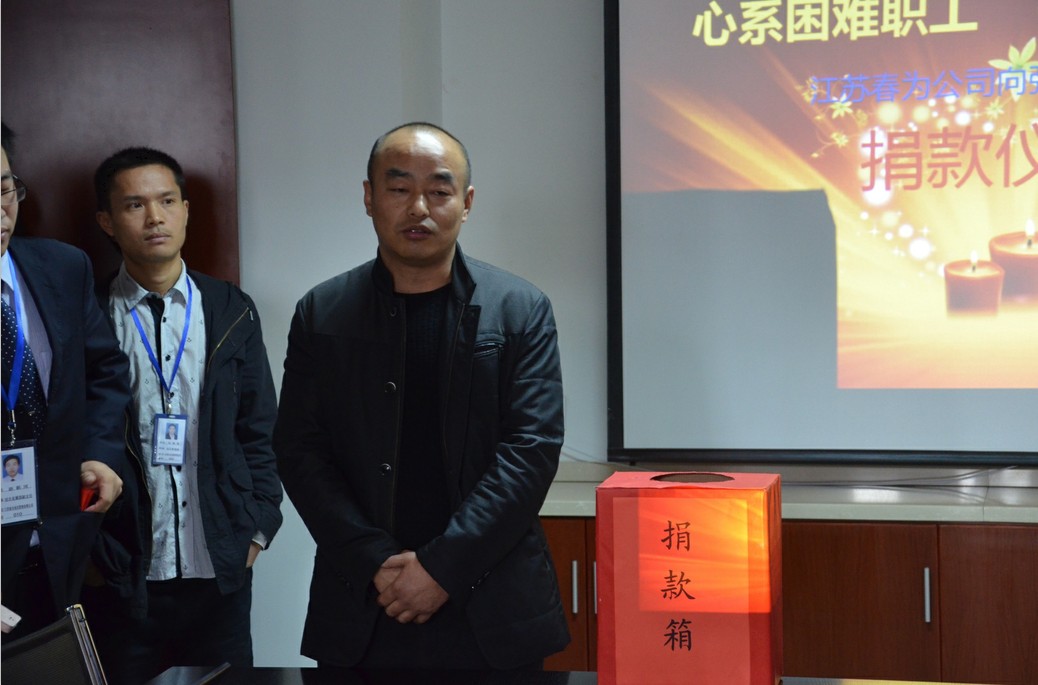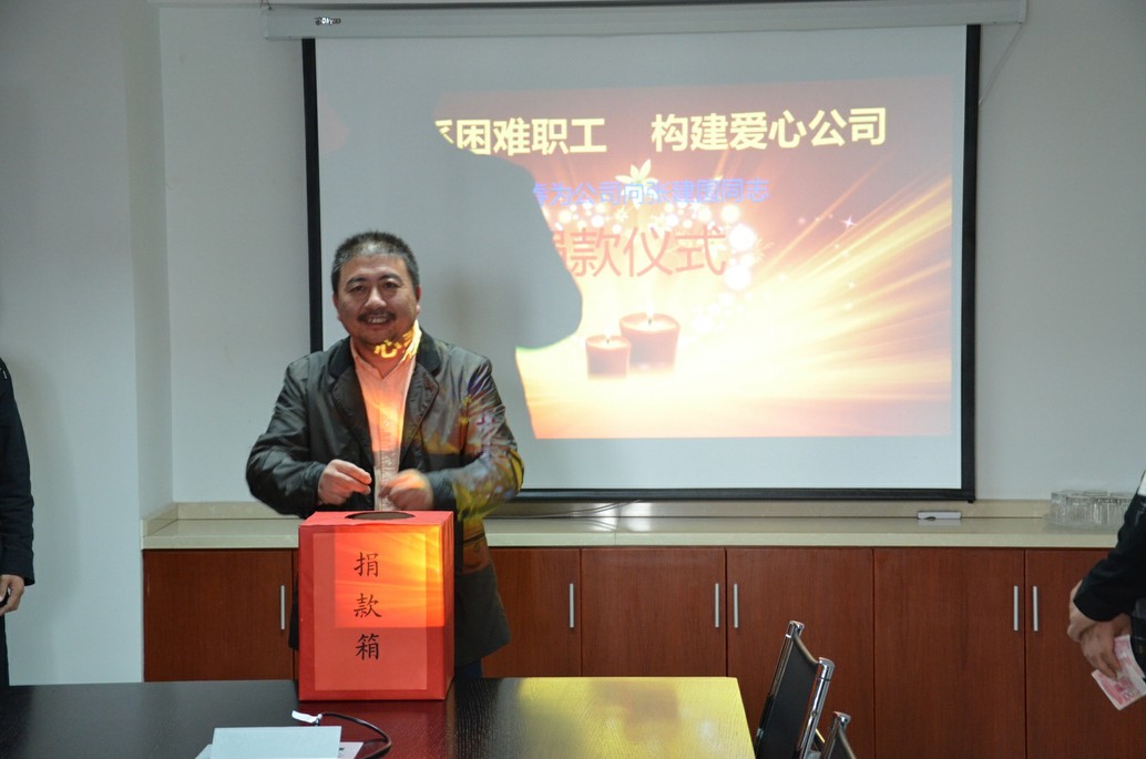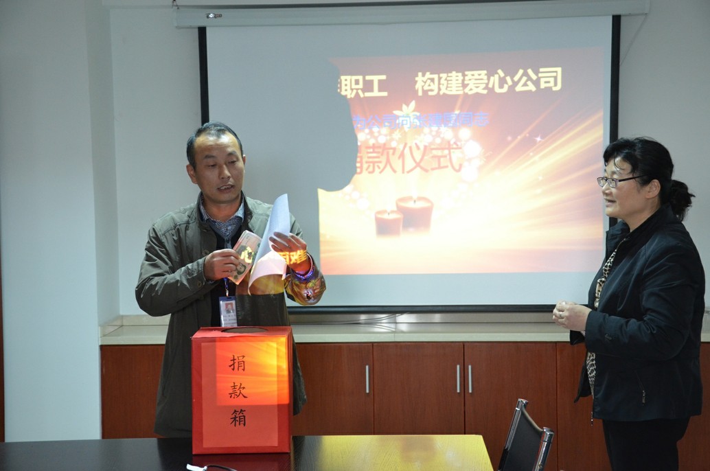 11月1日中午11点公司组织捐款仪式为病重员工张建国筹集善款,公司全体领导及同事纷纷伸出援手为张建国捐款,蒋总发表讲话,表达了对病重同事的极大关心。