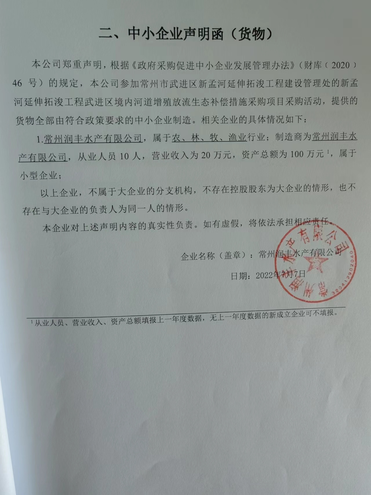 二、项目名称:新孟河延伸拓浚工程武进区境内河道增殖放流生态补偿措施采购项目