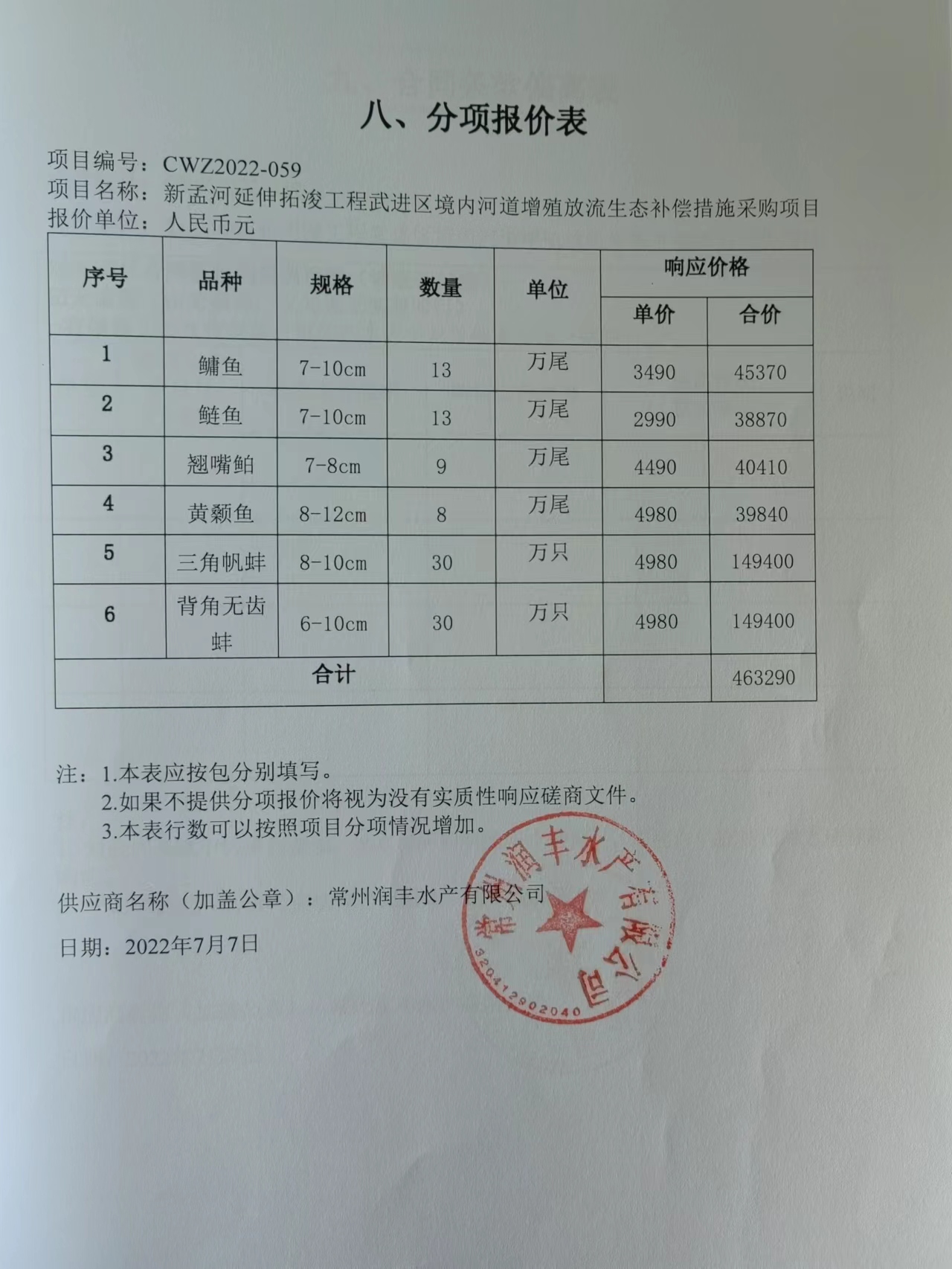 名称:鱼苗 品牌:/ 规格型号:详见附件分项报价表 数量:详见附件分项报价表 单价:详见附件分项报价表 |