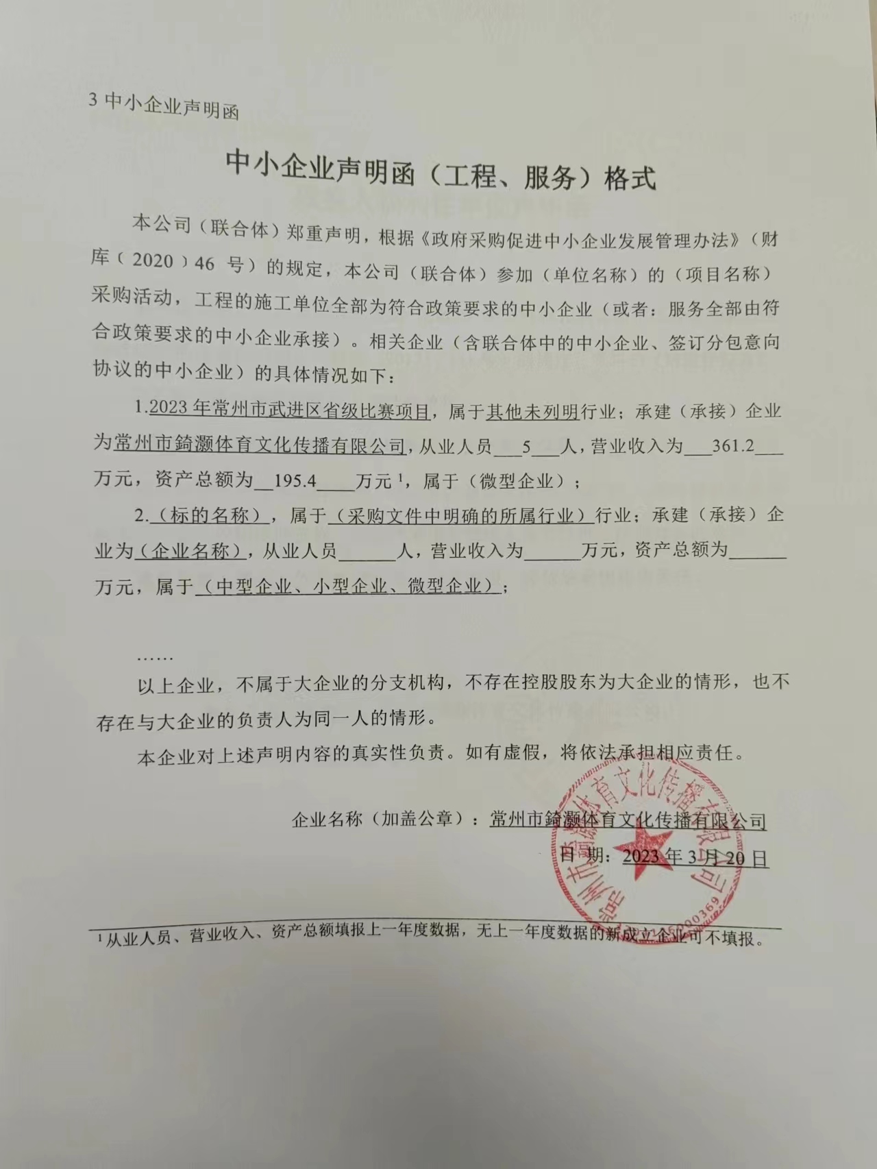 名称:2023年常州市武进区省级比赛项目 服务范围:根据每项体育赛事项目要求和采购人需求,提供赛事策划、推广和执行服务等。 服务要求:按照采购人批准的相关方案,协助完成赛事组织工作。 服务时间:自合同生效之日至全部比赛结束。 服务标准:满足采购文件及采购人要求。 |